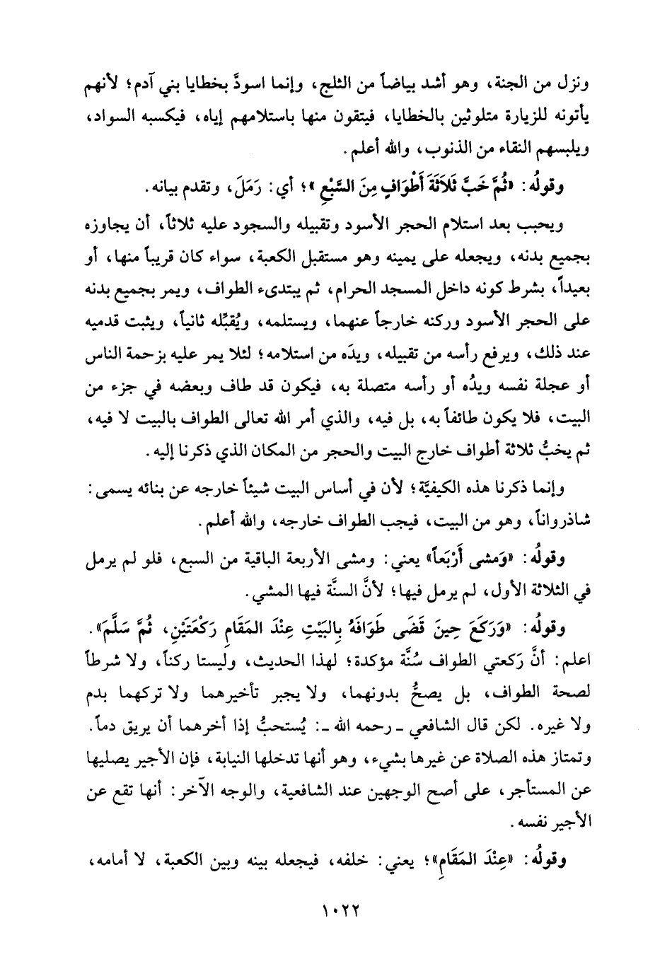 ويحبب بعد استلام الحجر الأسود وتقبيله والسجود عليه ثلاثًا، أن يجاوزه بجميع بدنه، ويجعله على يمينه وهو مستقبل الكعبة، سواء كان قريبا منها، أو بعيدًا، بشرط كونه داخل المسجد الحرام، ثم يبتدئ الطواف، ويمر بجميع بدنه على الحجر الأسود وركنه خارجًا عنهما، ويستلمه، ويُقبِّله ثانيًا، ويثبت قدميه عند ذلك، ويرفع رأسه من تقبيله، ويدَه من استلامه؛ لئلا يمر عليه بزحمة الناس أو عجلة نفسه ويدُه أو رأسه متصلة به، فيكون قد طاف وبعضه في جزء من البيت، فلا يكون طائفًا به، بل فيه، والذي أمر الله تعالى الطواف بالبيت لا فيه، ثم يخبُّ ثلاثة أطواف خارج البيت والحجر من المكان الذي ذكرنا إليه.