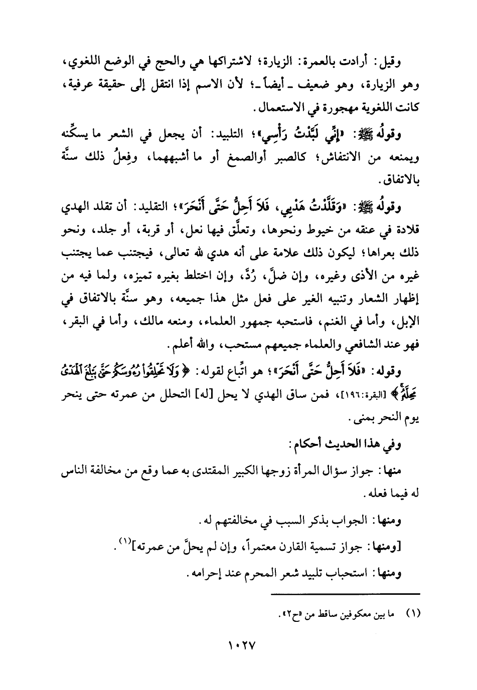 وقولُه - صلى الله عليه وسلم -: "إني لَبدْتُ رَأْسِي"؛ التلبيد: أن يجعل في الشعر ما يسكنه ويمنعه من الانتفاش؛ كالصبر أو الصمغ أو ما أشبههما، وفِعلُ ذلك سنَّة بالاتفاق.