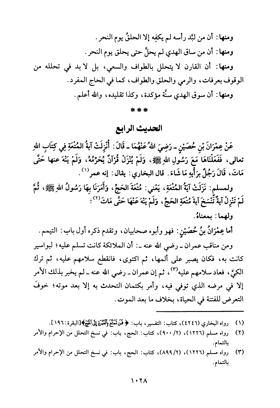 ولمسلمٍ: نَزلَتْ آيهُ المُتْعَةِ، يَعْني: مُتْعَةَ الحَجِّ، وَأَمَرَنَا بِهَا رَسُولُ اللهِ - صلى الله عليه وسلم -، ثُم لَمْ تَنْزِلْ آيةٌ تَنْسَخَ اَيةَ مُنْعَةِ الحَجِّ، وَلَمْ يَنْهَ عَنْهَا حَتَّى مَاتَ (¬2):
