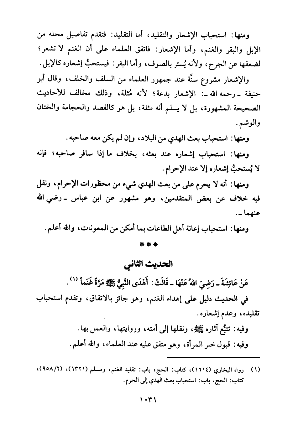 ومنها: استحباب الإشعار والتقليد، أما التقليد: فتقدم تفاصيل محله من الإبل والبقر والغنم، وأما الإشعار: فاتفق العلماء على أن الغنم لا تشعر؛ لضعفها عن الجرح، ولأنه يُستر بالصوف، وأما البقر: فيستحب إشعاره كالإبل.
