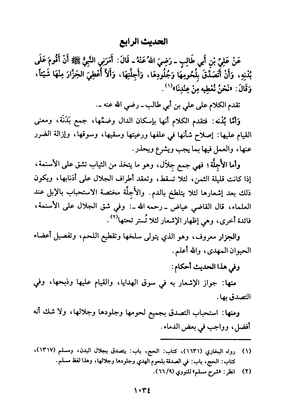 عَن عَلِي بْنِ أَبي طَالِبِ -رَضِيَ اللهُ عَنهُ- قَالَ: أَمَرَني النبِي - صلى الله عليه وسلم - أَنْ أَقُومَ عَلَى بُدنِهِ، وَأَن أتصَدقَ بِلُحُومهَا وَجُلُودِهَا، وَأَجِلَّتِهَا، وَأَلا أعطِيَ الجَزارَ مِنْهَا شَيْئًا، وَقَالَ: "نحْنُ نُعطِيه مِنْ عِندِنَا" (¬1).