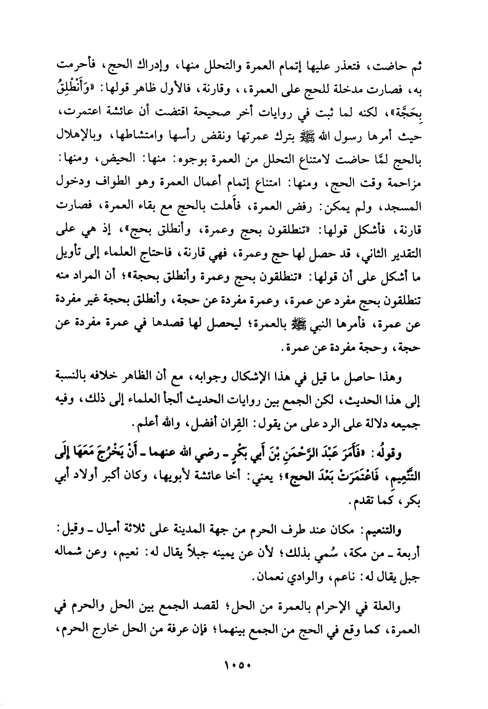 ثم حاضت، فتعذر عليها إتمام العمرة والتحلل منها، وإدراك الحج، فأحرمت به، فصارت مدخلة للحج على العمرة،، وقارنة، فالأول ظاهر قولها: "وَأَنْطْلِقُ بِحَجَّة"، لكنه لما ثبت في روايات أخر صحيحة اقتضت أن عائشة اعتمرت، حيث أمرها رسول الله - صلى الله عليه وسلم - بترك عمرتها ونقض رأسها وامتشاطها، وبالإهلال بالحج لما حاضت لامتناع التحلل من العمرة بوجوه: منها: الحيض، ومنها: مزاحمة وقت الحج، ومنها: امتناع إتمام أعمال العمرة وهو الطواف ودخول المسجد، ولم يمكن: رفض العمرة، فأهلت بالحج مع بقاء العمرة، فصارت قارنة، فأشكل قولها: "تنطلقون بحج وعمرة، وأنطلق بحج"، إذ هي على التقدير الثاني، قد حصل لها حج وعمرة، فهي قارنة، فاحتاج العلماء إلى تأويل ما أشكل على أن قولها: "تنطلقون بحج وعمرة وأنطلق بحجة"؛ أن المراد منه تنطلقون بحج مفرد عن عمرة، وعمرة مفردة عن حجة، وأنطلق بحجة غير مفردة عن عمرة، فأمرها النبي - صلى الله عليه وسلم - بالعمرة؛ ليحصل لها قصدها في عمرة مفردة عن حجة، وحجة مفردة عن عمرة.