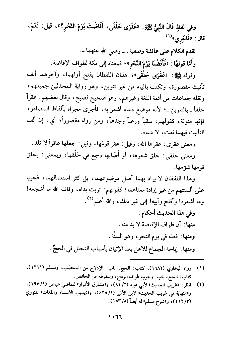 وفي لفظٍ قَالَ النَّبِيُّ - صلى الله عليه وسلم -: "عَقْرَى حَلْقَى، أفَاضَتْ يَوْمَ النَّحْرِ؟ "، قيل: نَعَمْ، قال: "فَانْفِرِي" (¬1).