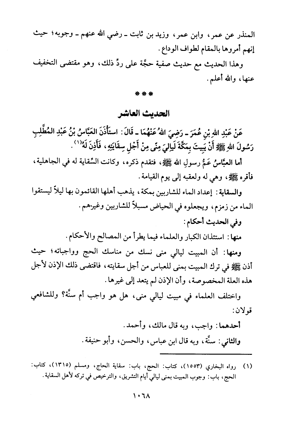 (¬1) رواه البخاري (1553)، كتاب: الحج، باب: سقاية الحاج، ومسلم (1315)، كتاب: الحج، باب: وجوب البيت بمنى ليالي أيام التشريق، والترخيص في تركه لأهل السقاية.