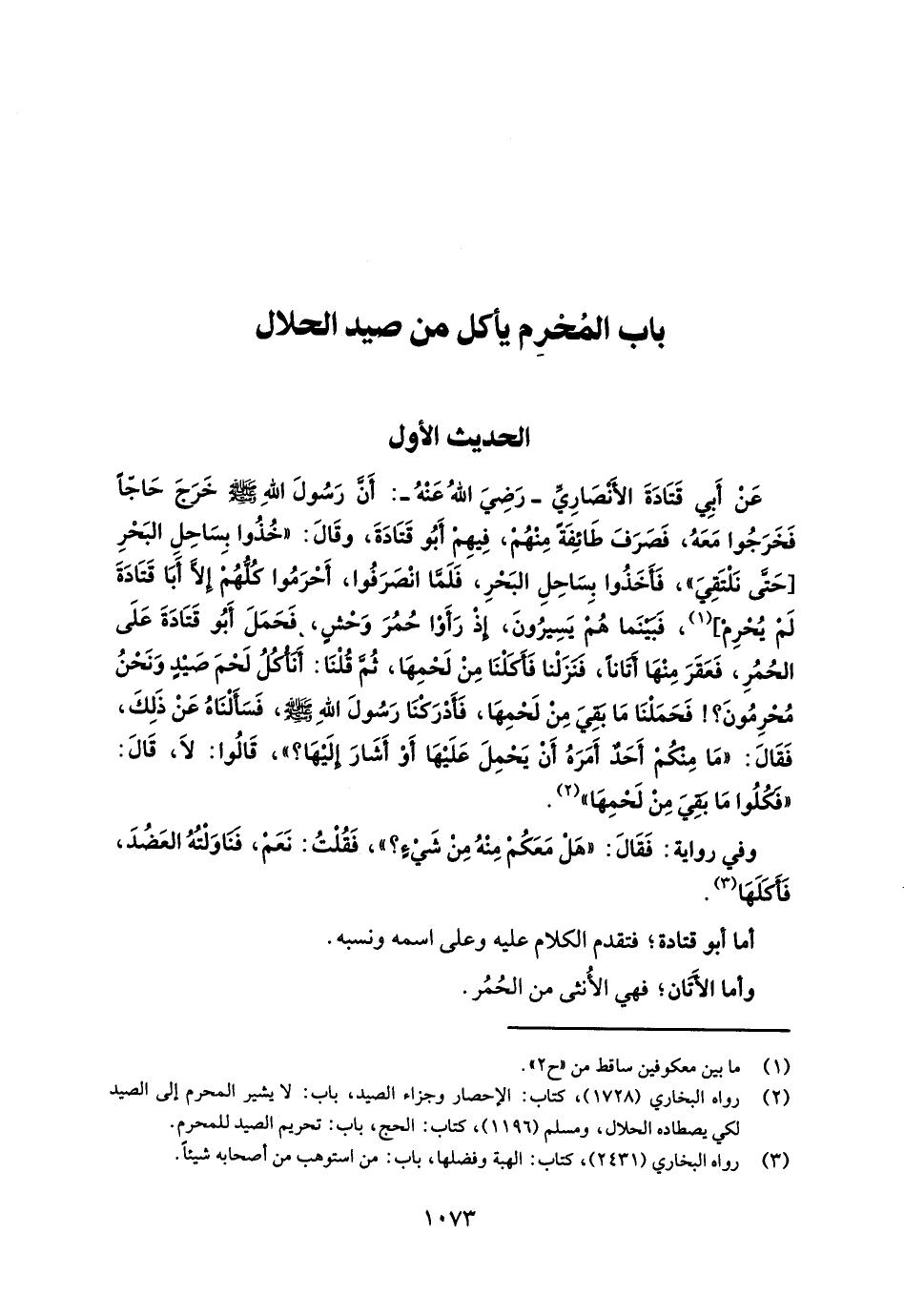 عَنْ أَبِي قَتَادَةَ الأَنْصَارِيِّ -رَضِيَ اللهُ عَنْهُ-: أَنَّ رَسُولَ اللهِ - صلى الله عليه وسلم - خَرَجَ حَاجًّا فَخَرَجُوا مَعَهُ، فَصَرَفَ طَائِفَةً مِنْهُمْ، فِيهِمْ أَبُو قَتَادَةَ، وقَالَ: "خُذُوا بسَاحِلِ البَحْرِ [حَتَّى نَلْتَقِيَ"، فَأَخَذُوا بِسَاحِلِ البَحْرِ، فَلَمَّا انْصَرَفُوا، أَحْرَمُوا كُلُّهُم إِلَّا أَبَا قَتَادَةَ لَمْ يُحْرِمْ] (¬1)، فَبَيْنَما هُمْ يَسِيرُونَ، إذْ رَأَوْا حُمُرَ وَحْشٍ، فَحَمَلَ أَبُو قَتَادَةَ عَلَى الحُمُرِ، فَعَقَرَ مِنْهَا أَتَانًا، فنَزَلْنا فَأَكَلْنَا مِنْ لَحْمِهَا، ثُمَّ قُلْنَا: أَنَأُكُلُ لَحْمَ صَيْدٍ وَنَحْنُ مُحْرِمُونَ؟! فَحَمَلْنَا مَا بَقِيَ مِن لَحْمِهَا، فَأَدْرَكْنَا رَسُولَ اللهِ - صلى الله عليه وسلم -، فَسَأَلْنَاهُ عَنْ ذَلِكَ، فَقَالَ: "مَا مِنْكُمْ أَحَدٌ أَمَرَهُ أَنْ يَحْمِلَ عَلَيْهَا أَوْ أَشَارَ إلَيْهَا؟ "، قَالُوا: لَا، قَالَ: "فَكُلُوا مَا بَقِيَ مِنْ لَحْمِهَا" (¬2).