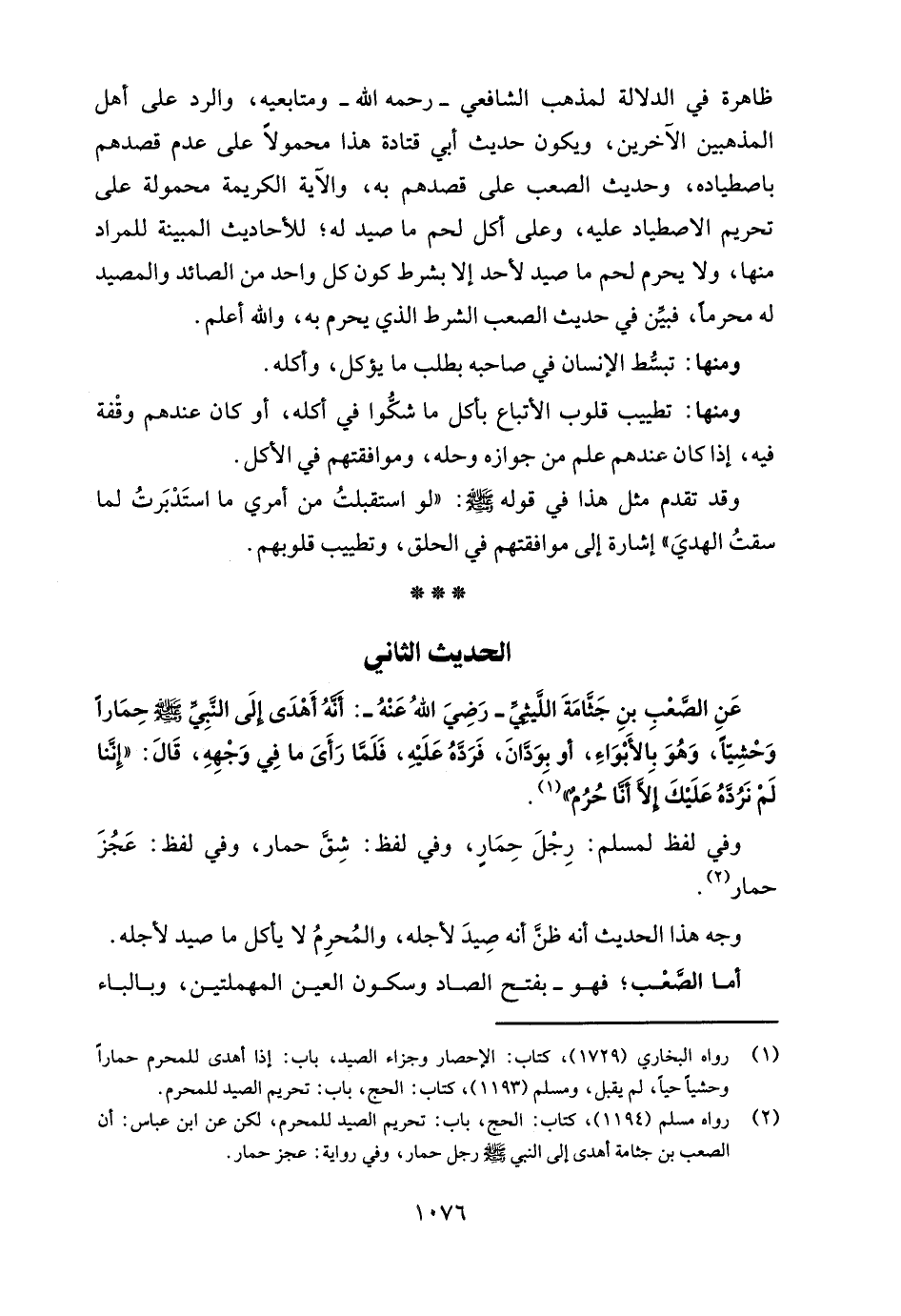 ظاهرة في الدلالة لمذهب الشافعي - رحمه الله - ومتابعيه، والرد على أهل المذهبين الآخرين، ويكون حديث أبي قتادة هذا محمولًا على عدم قصدهم باصطياده، وحديث الصعب على قصدهم به، والآية الكريمة محمولة على تحريم الاصطياد عليه، وعلى أكل لحم ما صيد له؛ للأحاديث المبينة للمراد منها، ولا يحرم لحم ما صيد لأحد إلا بشرط كون كل واحد من الصائد والمصيد له محرمًا، فبيِّن في حديث الصعب الشرط الذي يحرم به، والله أعلم.