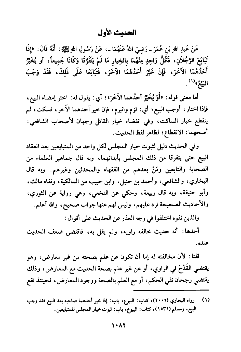 عَنْ عَبدِ اللهِ بْنِ عُمَرَ -رَضِيَ اللهُ عَنْهُمَا-، عَنْ رَسُولِ اللهِ - صلى الله عليه وسلم -: أَنَّهُ قَالَ: "إِذَا تَبَايَعَ الرَّجُلاَنِ، فَكُلُّ وَاحِدٍ مِنْهُمَا بِالخِيارِ مَا لَمْ يَتَفَرَّقَا وَكَانَا جَمِيعًا، أو يُخَيِّرُ أَحَدُهُمَا الآخَرَ، فَإِنْ خَيَّرَ أَحَدُهُمَا الآخَرَ، فَتَبَايَعَا عَلَى ذَلِكَ، فَقَدْ وَجَبَ البَيْعُ" (¬1).