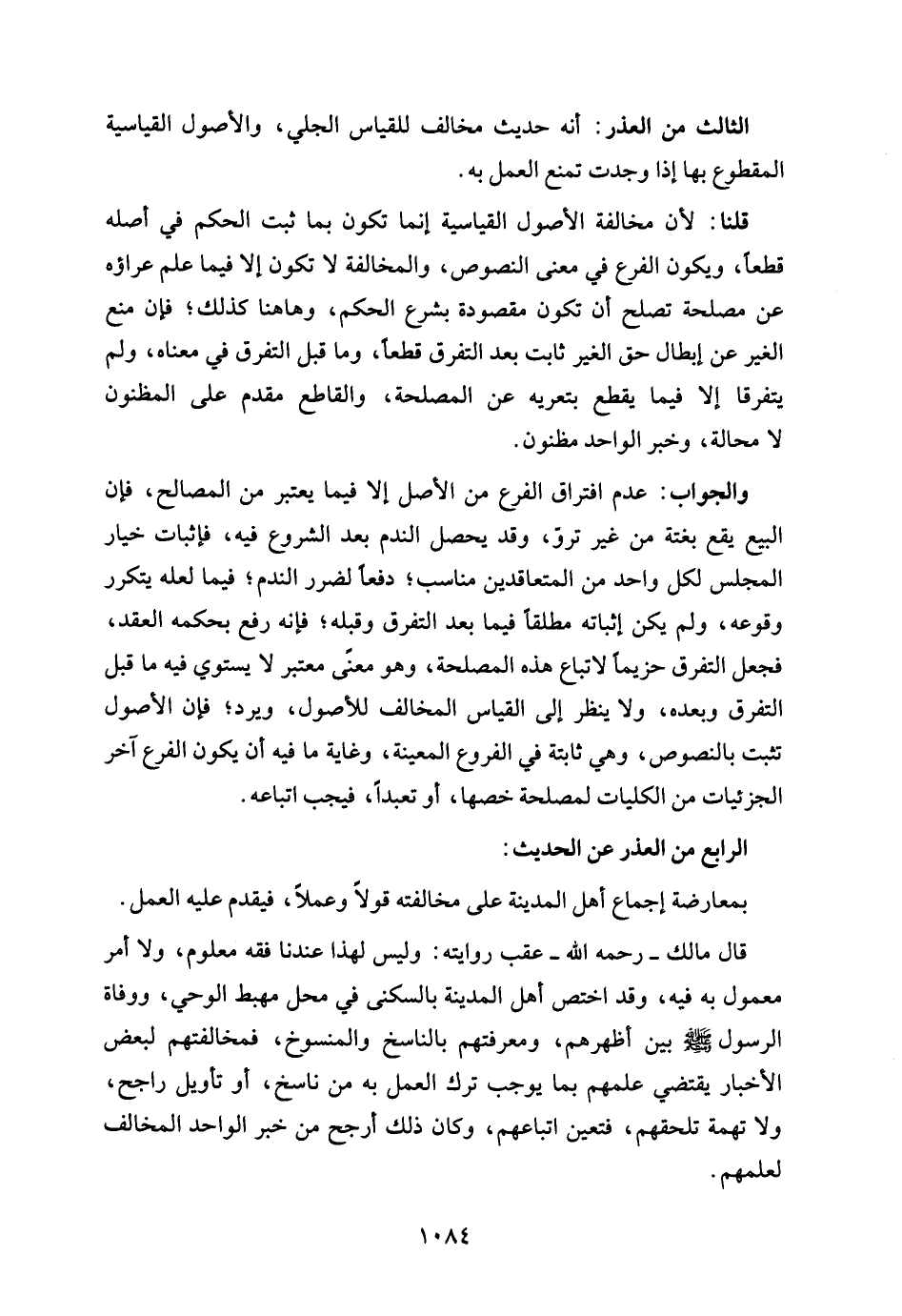 الثالث من العذر: أنه حديث مخالف للقياس الجلي، والأصول القياسية المقطوع بها إذا وجدت تمنع العمل به.