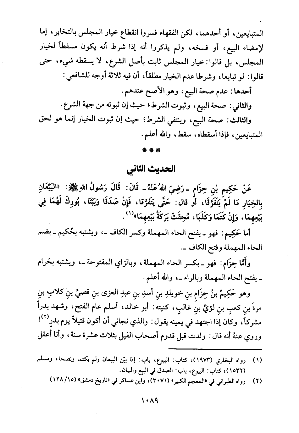 عَنْ حَكِيمِ بْنِ حِزَامٍ -رَضِيَ اللهُ عَنْهُ- قَالَ: قَالَ رَسُولُ اللهِ - صلى الله عليه وسلم -: "البَيِّعَانِ بِالخِيَارِ مَا لَمْ يَتَفَرَّقَا، أو قال: حَتَّى يَتَفرَّقا، فَإِنْ صَدَقَا وَبَيَّنَا، بُورِكَ لَهُمَا فِي بَيْعِهِمَا، وَإنْ كَتَمَا وَكَذَبَا، مُحِقَتْ برَكَةُ بَيْعِهِمَا" (¬1).