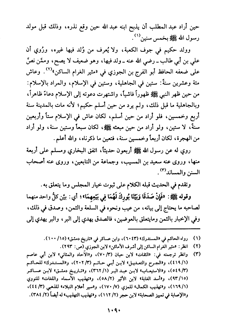 وولد حكيم في جوف الكعبة، ولا يُعرف من وُلد فيها غيره، ورُوي أن علي بن أبي طالب - رضي الله عنه - ولد فيها، وهو ضعيف لا يصح، وممَّن نصَّ على ضعفه الحافظ أبو الفرج بن الجوزي في "مثير الغرام الساكن" (¬2). وعاش مئة وعشرين سنةً: ستين في الجاهلية، وستين في الإسلام، والمراد بالإسلام: من حين ظهر النبي - صلى الله عليه وسلم - ظهورًا فاشيًا، واشتهرت دعوته إلى الإسلام دعاءً ظاهرًا، وبالجاهلية ما قبل ذلك، ولم يرد من حين أسلم حكيم؛ لأنه مات بالمدينة سنة أربع وخمسين، فلو أراد من حين أسلم، لكان عاش في الإسلام ستًّا وأربعين سنةً، لا ستين، ولو أراد من حين مبعثه - صلى الله عليه وسلم -، لكان سبعًا وستين سنة، ولو أراد من الهجرة، لكان أربعًا وخمسين سنة، فتعين ما ذكرناه، والله أعلم.