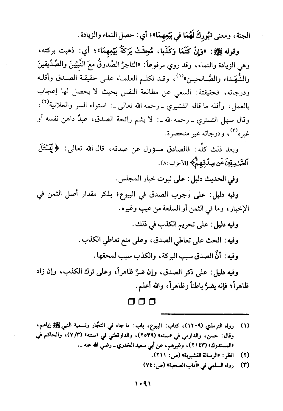 وقوله - صلى الله عليه وسلم -: "وَإنْ كَتَمَا وَكَذَبا، مُحِقَتْ برَكَةُ بَيْعِهِمَا"؛ أي: ذهبت بركته، وهي الزيادة والنماء، وقد روي مرفوعًا: "التاجرُ الصَّدوقُ معَ النَّبيِّينَ والصِّدِّيقينَ والشُّهَداء والصَّالحين" (¬1)، وقد تكلم العلماء على حقيقة الصدق وأقله ودرجاته، فحقيقته: السعي عن مطالعة النفس بحيث لا يحصل لها إعجاب بالعمل، وأقله ما قاله القشيري -رحمه الله تعالى-: استواء السر والعلانية (¬2)، وقال سهل التستري - رحمه الله -. لا يشم رائحة الصدق، عبدٌ داهن نفسه أو غيره (¬3)، ودرجاته غير منحصرة.