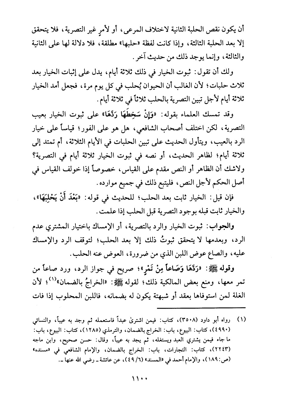 والجواب: ثبوت الخيار والرد بالتصرية، أو الإمساك باختيار المشتري عدم الرد، وبعدمها لا يتحقق ثبوتُ ذلك إلا بعد الحلب؛ لتوقف الرد والإمساك عليه، والصاع عوض اللبن الذي من ضرورة، العوض عنه الحلب.