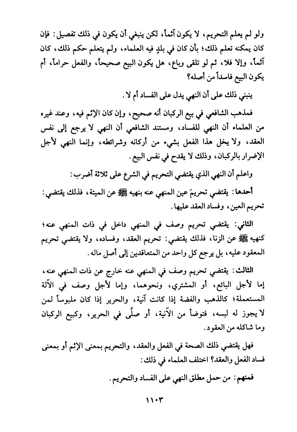 الثالث: يقتضي تحريم وصف في المنهي عنه خارج عن ذات المنهي عنه، إما لأجل البائع، أو المشتري، ونحوهما، وإما لأجل وصف في الآلة المستعملة؛ كالذهب والفضة إذا كانت آنية، والحرير إذا كان ملبوسًا لمن لا يجوز له لبسه، فتوضأ من الآنية، أو صلَّى في الحرير، وكبيع الركبان وما شاكله من العقود.