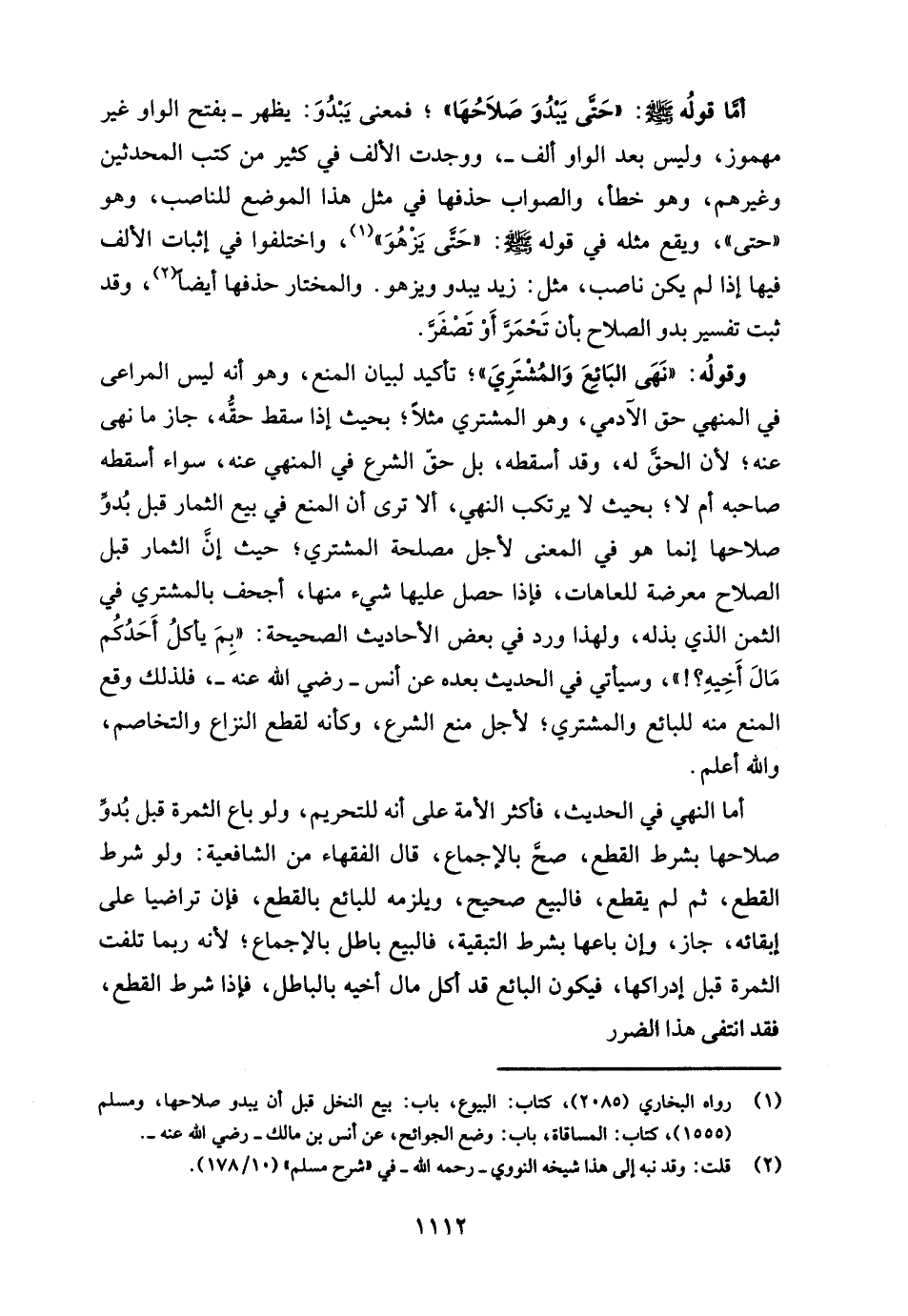 أما النهي في الحديث، فأكثر الأمة على أنه للتحريم، ولو باع الثمرة قبل بُدوِّ صلاحها بشرط القطع، صحَّ بالإجماع، قال الفقهاء من الشافعية: ولو شرط القطع، ثم لم يقطع، فالبيع صحيح، ويلزمه للبائع بالقطع، فإن تراضيا على إبقائه، جاز، وإن باعها بشرط التبقية، فالبيع باطل بالإجماع؛ لأنه ربما تلفت الثمرة قبل إدراكها، فيكون البائع قد أكل مال أخيه بالباطل، فإذا شرط القطع، فقد انتفى هذا الضرر.
