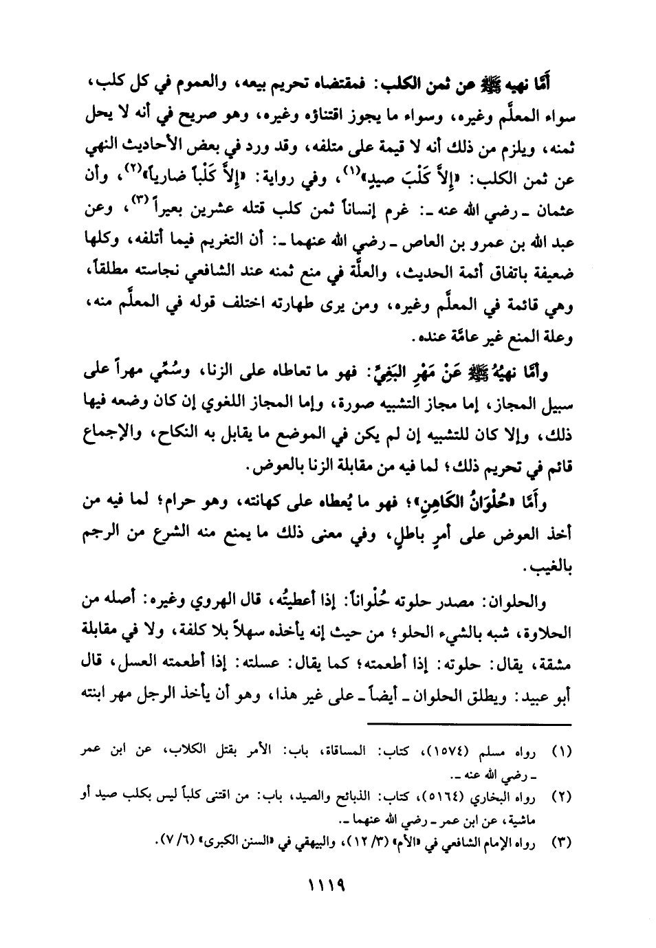 أمَّا نهيه - صلى الله عليه وسلم - عن ثمن الكلب: فمقتضاه تحريم بيعه، والعموم في كل كلب، سواء المعلَّم وغيره، وسواء ما يجوز اقتناؤه وغيره، وهو صريح في أنه لا يحل ثمنه، ويلزم من ذلك أنه لا قيمة على متلفه، وقد ورد في بعض الأحاديث النهي عن ثمن الكلب: "إلَّا كَلْبَ صيدٍ" (¬1)، وفي رواية: "إلا كَلْبًا ضاريًا" (¬2)، وأن عثمان - رضي الله عنه -: غرم إنسانًا ثمن كلب قتله عشرين بعيرًا (¬3)، وعن عبد الله بن عمرو بن العاص - رضي الله عنهما -: أن التغريم فيما أتلفه، وكلها ضعيفة باتفاق أئمة الحديث، والعلَّة في منع ثمنه عند الشافعي نجاسته مطلقًا، وهي قائمة في المعلَّم وغيره، ومن يرى طهارته اختلف قوله في المعلَّم منه، وعلة المنع غير عامَّة عنده.