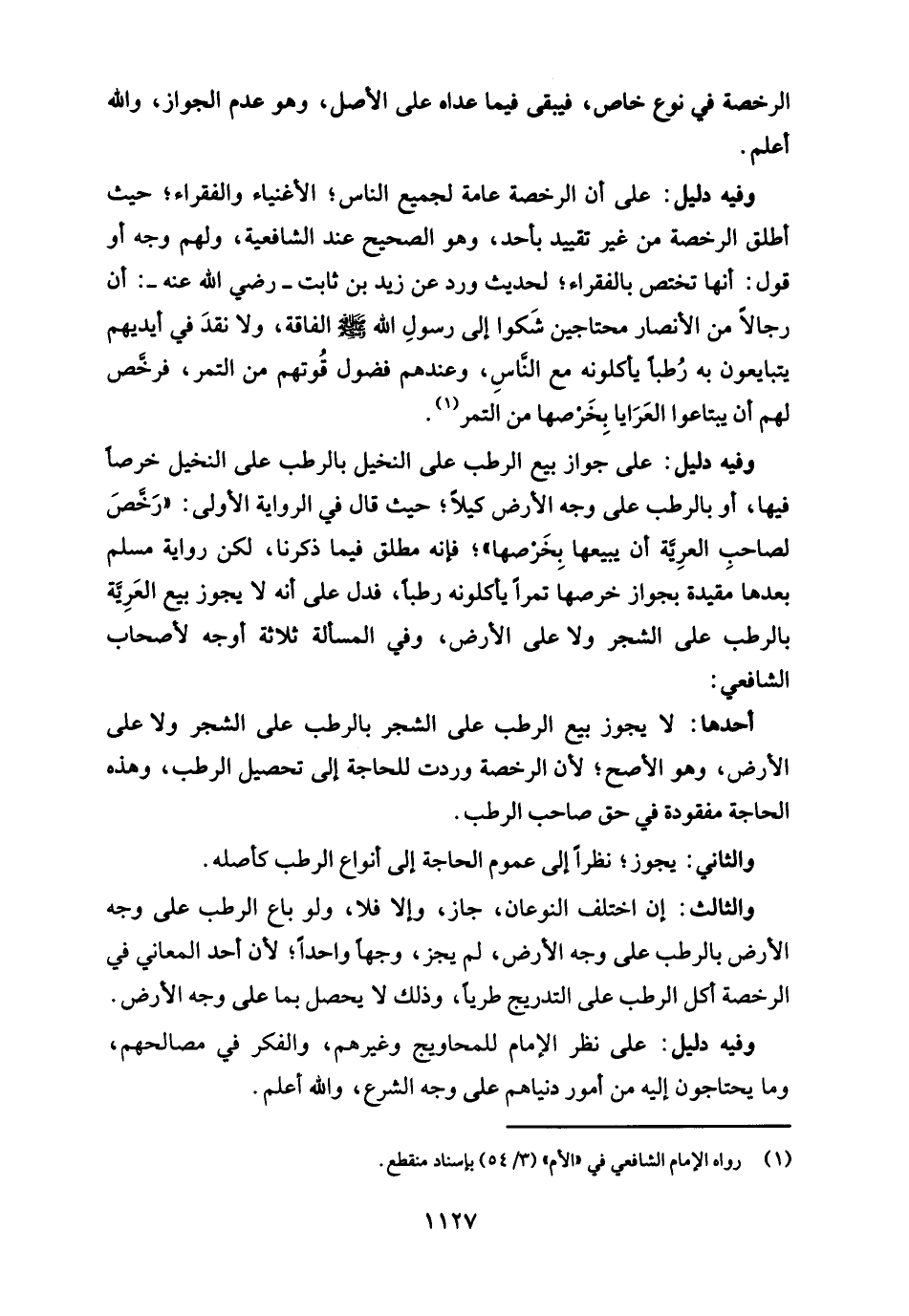 وفيه دليل: على جواز بيع الرطب على النخيل بالرطب على النخيل خرصًا فيها، أو بالرطب على وجه الأرض كيلًا؛ حيث قال في الرواية الأولى: "رَخَّصَ لصاحبِ العرِيَّة أن يبيعها بِخَرصها"؛ فإنه مطلق فيما ذكرنا، لكن رواية مسلم بعدها مقيدة بجواز خرصها تمرًا يأكلونه رطبًا، فدل على أنه لا يجوز بيع العَرِيَّة بالرطب على الشجر ولا على الأرض، وفي المسألة ثلاثة أوجه لأصحاب الشافعي: