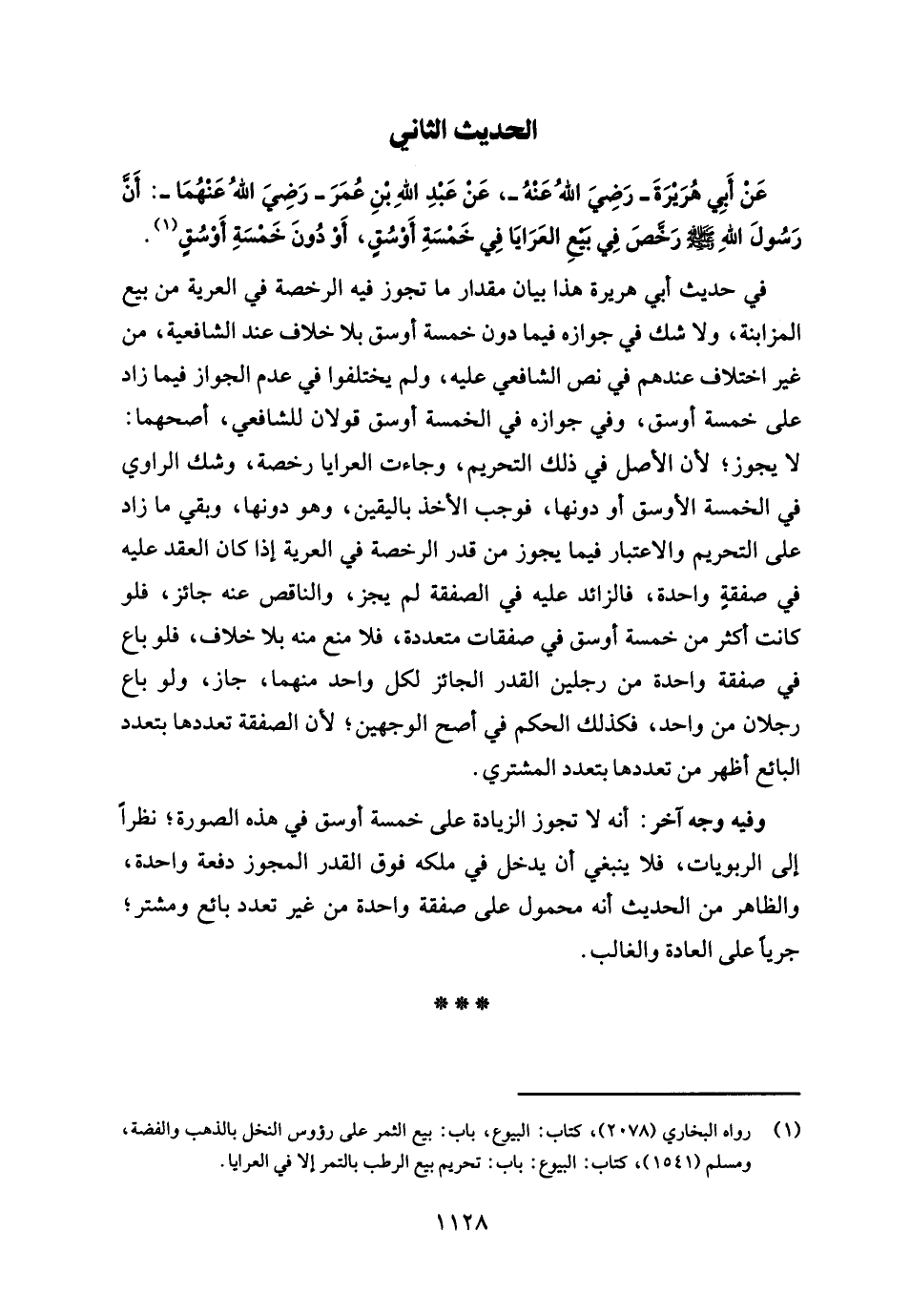 عَن أَبِي هُرَيرةَ -رَضِيَ اللهُ عَنهُ-، عَن عَبدِ اللهِ بنِ عُمَرَ -رَضِيَ اللهُ عَنهُمَا-: أَن رَسُولَ اللهِ - صلى الله عليه وسلم - رَخَّصَ في بيعِ العَرَايَا في خَمْسَةِ أَوسُقٍ، أَوْ دُونَ خَمسَةِ أَوْسُقٍ (¬1).