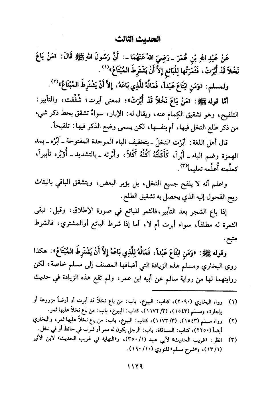 (¬1) رواه البخاري (2090)، كتاب: البيوع، باب: من باع نخلًا قد أبرت أو أرضًا مزروعة أو بإجارة، ومسلم (1543)، (3/ 1172)، كتاب: البيوع، باب: من باع نخلًا عليها ثمر.