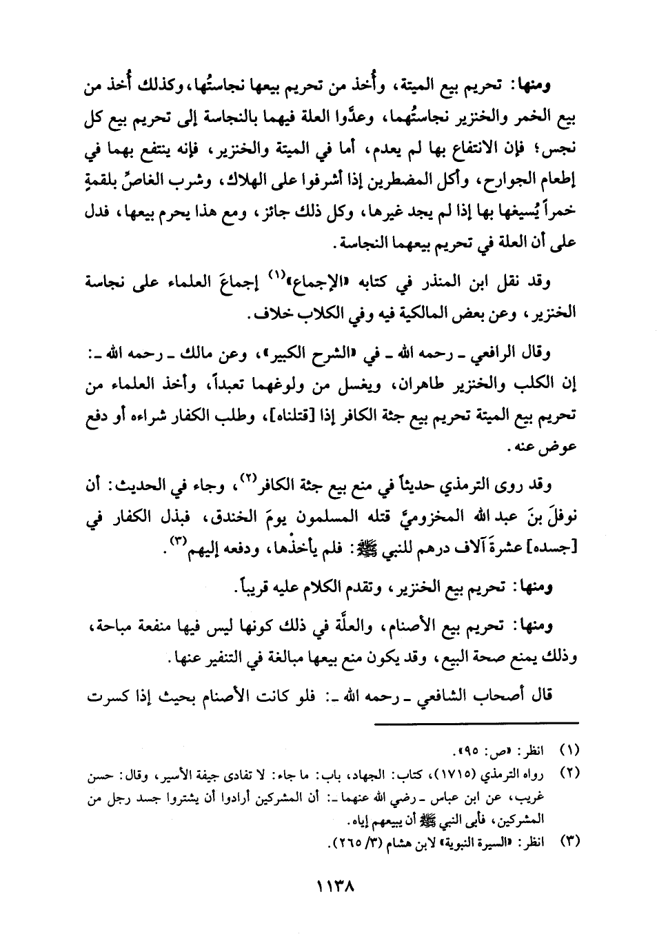 ومنها: تحريم بيع الميتة، وأُخذ من تحريم بيعها نجاستُها، وكذلك أُخذ من بيع الخمر والخنزير نجاستُهما، وعدَّوا العلة فيهما بالنجاسة إلى تحريم بيع كل نجس؛ فإن الانتفاع بها لم يعدم، أما في الميتة والخنزير، فإنه ينتفع بهما في إطعام الجوارح، وأكل المضطرين إذا أشرفوا على الهلاك، وشرب الغاصِّ بلقمةٍ خمرًا يُسيغها بها إذا لم يجد غيرها، وكل ذلك جائز، ومع هذا يحرم بيعها، فدل على أن العلة في تحريم بيعهما النجاسة.