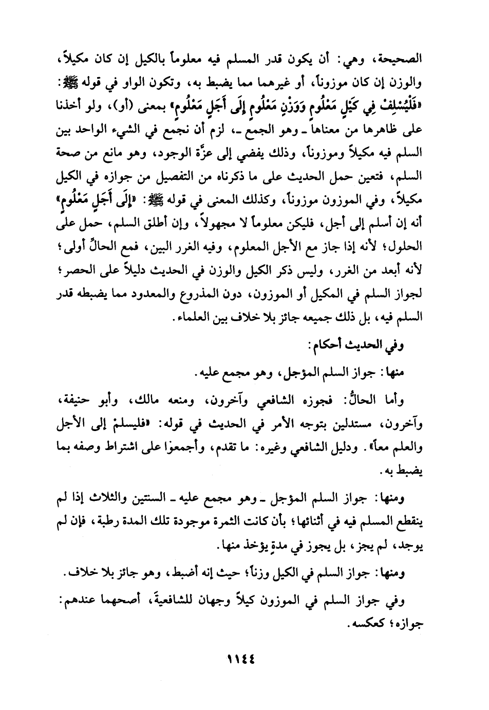 الصحيحة، وهي: أن يكون قدر المسلم فيه معلومًا بالكيل إن كان مكيلًا، والوزن إن كان موزونًا، أو غيرهما مما يضبط به، وتكون الواو في قوله - صلى الله عليه وسلم -: "فَليُسلِف في كَيْلٍ مَعْلُومٍ وَوَزنِ مَعْلُومٍ إلَى أَجَلٍ مَعلُومٍ" بمعنى (أو)، ولو أخذنا على ظاهرها من معناها -وهو الجمع-، لزم أن نجمع في الشيء الواحد بين السلم فيه مكيلًا وموزونًا، وذلك يفضي التي عزَّة الوجود، وهو مانع من صحة السلم، فتعين حمل الحديث على ما ذكرناه من التفصيل من جوازه في الكيل مكيلًا، وفي الموزون موزونًا، وكذلك المعنى في قوله - صلى الله عليه وسلم -: "إلَى أَجَلٍ مَعْلُومٍ" أنه إن أسلم إلى أجل، فليكن معلومًا لا مجهولًا، وإن أطلق السلم، حمل على الحلول؛ لأنه إذا جاز مع الأجل المعلوم، وفيه الغرر البين، فمع الحال أولى؛ لأنه أبعد من الغرر، وليس ذكر الكيل والوزن في الحديث دليلًا على الحصر؛ لجواز السلم في المكيل أو الموزون، دون المذروع والمعدود مما يضبطه قدر السلم فيه، بل ذلك جميعه جائز بلا خلاف بين العلماء.