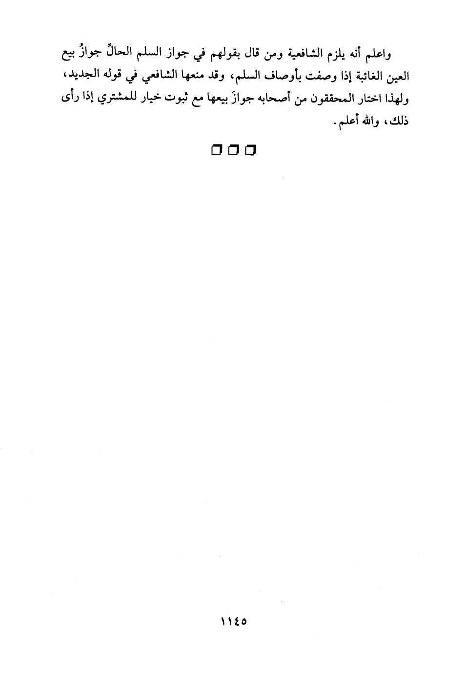 واعلم أنه يلزم الشافعية ومن قال بقولهم في جواز السلم الحال جوازُ بيع العين الغائبة إذا وصفت بأوصاف السلم، وقد منعها الشافعي في قوله الجديد، ولهذا اختار المحققون من أصحابه جوازَ بيعها مع ثبوت خيار للمشتري إذا رأى ذلك، والله أعلم.