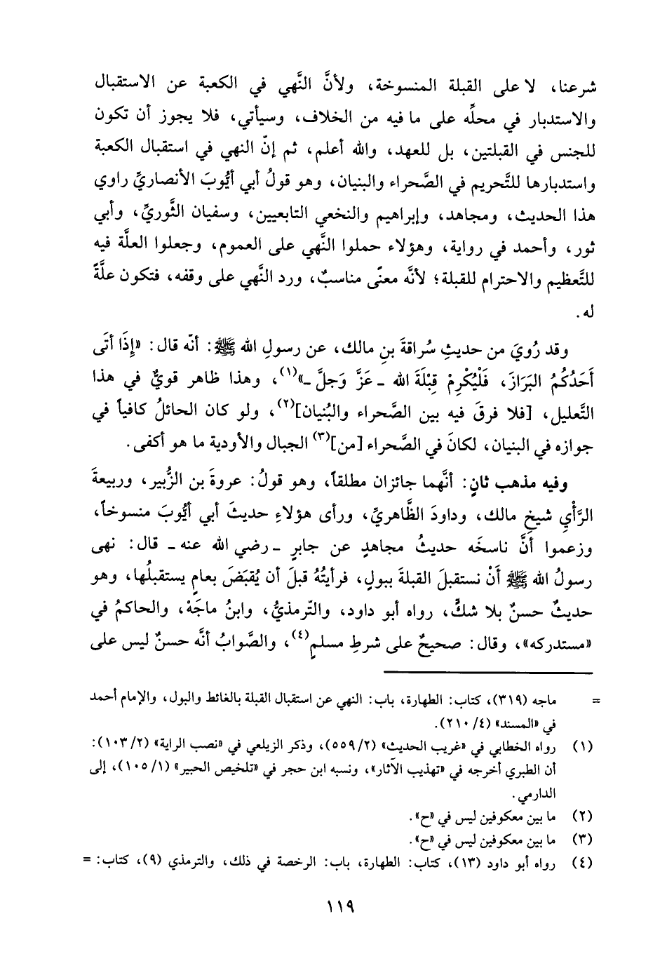 وفيه مذهب ثانٍ: أنهما جائزان مطلقًا، وهو قولُ: عروةَ بن الزبير، وربيعةَ الرَّأْيِ شيخِ مالك، وداودَ الظَّاهريِّ، ورأى هؤلاءِ حديثَ أبي أيوبَ منسوخًا، وزعموا أن ناسخَه حديثُ مجاهدٍ عن جابرٍ - رضي الله عنه - قال: نهى رسولُ الله - صلى الله عليه وسلم - أَنْ نستقبلَ القبلةَ ببولٍ، فرأيتُهُ قبلَ أن يُقبَضَ بعامٍ يستقبلُها، وهو حديثٌ حسنٌ بلا شكٍّ، رواه أبو داود، والتّرمذي، وابنُ ماجَهْ، والحاكمُ في "مستدركه"، وقال: صحيحٌ على شرطِ مسلمٍ (¬4)، والصَّوابُ أنه حسنٌ ليس على