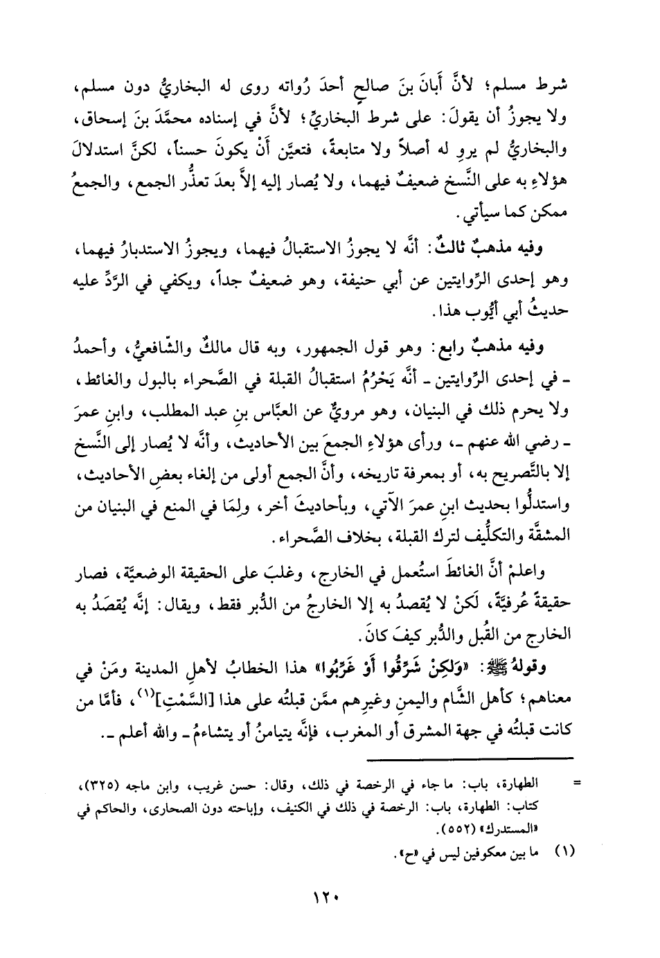 وفيه مذهبٌ رابع: وهو قول الجمهور، وبه قال مالكٌ والشّافعي، وأحمدُ -في إحدى الروايتين- أنه يَحْرُمُ استقبالُ القبلة في الصحراء بالبول والغائط، ولا يحرم ذلك في البنيان، وهو مرويٌّ عن العباس بنِ عبد المطلب، وابنِ عمرَ -رضي الله عنهم-، ورأى هؤلاءِ الجمعَ بين الأحاديث، وأنه لا يُصار إلى النسخ إلا بالتَّصريح به، أو بمعرفة تاريخه، وأن الجمع أولى من إلغاء بعضِ الأحاديث، واستدلُّوا بحديث ابنِ عمرَ الآتي، وبأحاديثَ أخر، ولِمَا في المنع في البنيان من المشقَّة والتكلُّف لترك القبلة، بخلاف الصحراء.