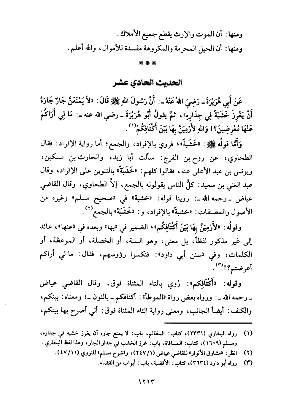 عَنْ أَبِي هُرَيْرَةَ -رَضِيَ اللهُ عَنْهُ-: أَنَّ رَسولَ اللهِ - صلى الله عليه وسلم - قَالَ: "لَا يَمْنَعَنَّ جَارٌ جَارَهُ أَنْ يَغْرِزَ خَشَبَةً فِي جِدَارِهِ"، ثمّ يقولُ أَبُو هُرَيْرَةَ - رضي الله عنه -: مَا لِي أَرَاكُمْ عَنْهَا مُعْرِضِينَ؟! وَاللهِ لأَرْميَنَّ بِهَا بينَ أَكْتَافِكُمْ (¬1).