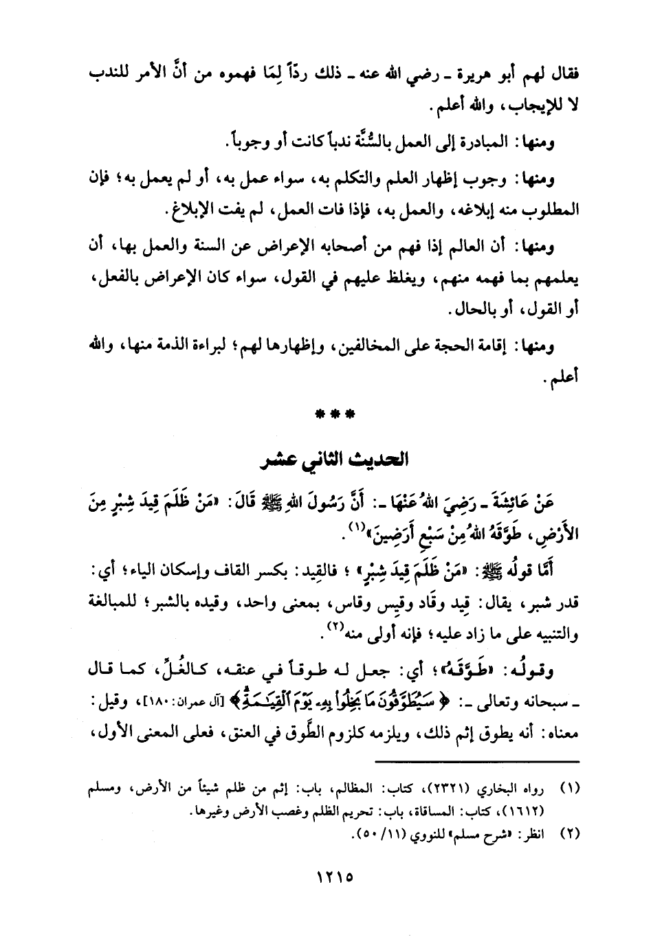 عَنْ عَائشِةَ -رَضِيَ اللهُ عَنْهَا-: أَنَّ رَسُولَ اللهِ - صلى الله عليه وسلم - قَالَ: "مَنْ ظَلَمَ قِيدَ شِبْرٍ مِنَ الأَرْضِ، طَوَّقَهُ اللهُ مِنْ سَبْعِ أَرَضِينَ" (¬1).