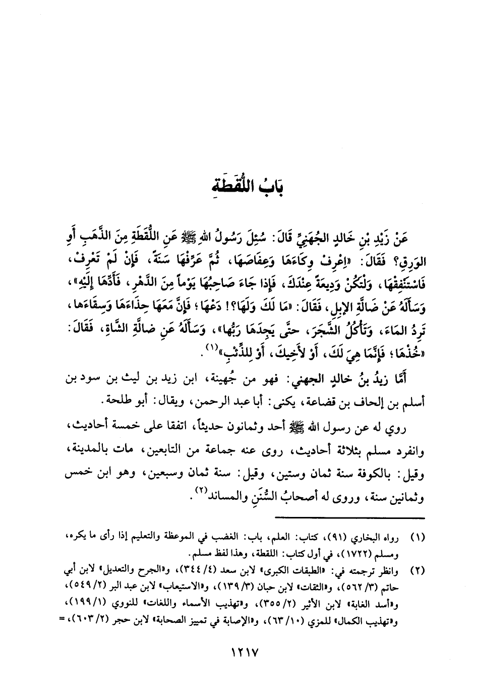 عَنْ زَيْدِ بْنِ خَالدٍ الجُهَنِيِّ قَالَ: سُئِلَ رَسُولُ اللهِ - صلى الله عليه وسلم - عَنِ اللُّقَطَةِ مِنَ الذَّهَبِ أَوِ الوَرِقِ؟ فَقَالَ: "اِعْرِفْ وِكَاءَهَا وَعِفَاصَهَا، ثُمَّ عَرِّفْهَا سَنَةً، فَإنْ لَمْ تَعْرِفْ، فَاسْتنفِقْهَا، وَلْتكُنْ وَدِيعَةً عِنْدَكَ، فَإِذا جَاءَ صَاحِبُهَا يَوْمًا مِنَ الدَّهْرِ، فَأَدِّهَا إلَيْهِ"، وَسَأَلهُ عَنْ ضَالَّةِ الإبِلِ، فَقَالَ: "مَا لَكَ وَلَهَا؟! دَعْهَا؛ فَإنَّ مَعَهَا حِذَاءَهَا وَسِقَاءَها، تَرِدُ المَاءَ، وَتَأكُلُ الشَّجَرَ، حتَّى يَجِدَهَا رَبُّها"، وَسَأَلَهُ عَنِ ضالَّةِ الشَّاةِ، فَقَالَ: "خُذْهَا؛ فَإنَّمَا هِيَ لَكَ، أَوْ لأَخِيكَ، أَوْ لِلذِّئْبِ" (¬1).