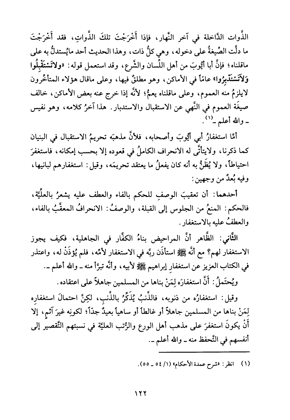 الذوات الدَّاخلة في آخر النهار، فإذا أَخْرَجْتَ تلكَ الذَّواتِ، فقد أَخْرَجْتَ ما دلَّت الصيغةُ على دخوله، وهي كل ذات، وهذا الحديث أحد ما يُستدلُّ به على ما قلناه؛ فإن أبا أيوبَ من أهل اللسان والشَّرع، وقد استعمل قوله: "ولا تَسْتَقْبِلُوا وَلا تسْتدبِرُوا" عامًّا في الأماكن، وهو مطلقٌ فيها، وعلى ما قال هؤلاء المتأخِّرون لا يلزمُ منه العموم، وعلى ما قلناه يعمُّ؛ لأنه إذا خرج عنه بعض الأماكن، خالف صيغَة العموم في النَّهي عن الاستقبال والاستدبار. هذا آخرُ كلامه، وهو نفيس - والله أعلم - (¬1).