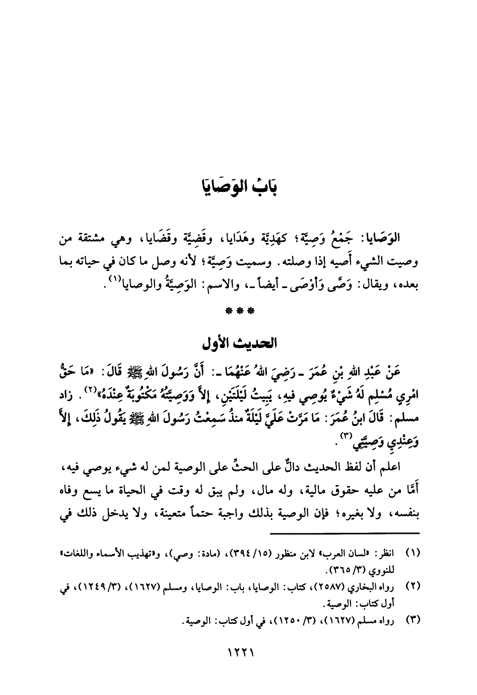 عَنْ عَبْدِ اللهِ بْنِ عُمَرَ -رَضِيَ اللهُ عَنْهُمَا-: أَن رَسُولَ اللهِ - صلى الله عليه وسلم - قَالَ: "مَا حَقُّ امْرِىٍ مُسْلِمٍ لَهُ شَيْءٌ يُوصِي فيهِ، يَبِيتُ لَيْلَتَيْنِ، إلَّا وَوَصِيَّتُهُ مَكْتُوبَةٌ عِنْدَهُ" (¬2). زاد مسلم: قَالَ ابنُ عُمَرَ: مَا مَرَّتْ عَلَيَّ لَيْلَةٌ منذُ سَمِعْتُ رَسُولَ اللهِ - صَلَّى الله عليه وسلم - يَقُولُ ذَلِكَ، إلَّا وَعِنْدِيِ وَصِيَّتي (¬3).