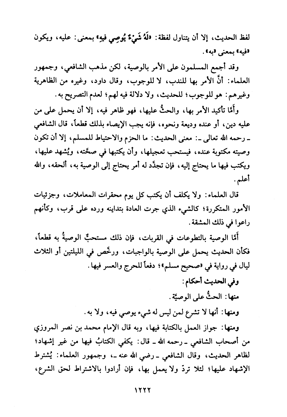 وأَمَّا تأكيد الأمر بها، والحثُّ عليها، فهو ظاهر فيه، إلَّا أن يحمل على من عليه دين، أو عنده وديعة ونحوه، فإنّه يجب الإيصاء بذلك قطعًا، قال الشَّافعي -رحمه الله تعالى-: معنى الحديث: ما الحزم والاحتياط للمسلم، إلَّا أن تكون وصيته مكتوبة عنده، فيستحب تعجيلها، وأن يكتبها في صحَّته، ويُشهد عليها، ويكتب فيها ما يحتاج إليه، فإن تجدَّد له أمر يحتاج إلى الوصيَّة به، ألحقه، والله أعلم.