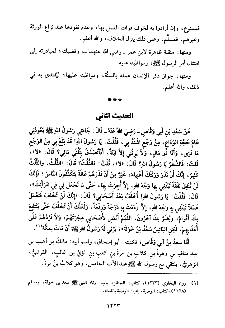 عَنْ سَعْدِ بْنِ أَبي وَقاصٍ -رَضِيَ اللهُ عَنهُ- قَالَ: جَاءَنِي رَسُولُ اللهِ - صلى الله عليه وسلم - يَعُودني عَامَ حَجَّةِ الوَدَاع، مِن وَجَع اشتد بِي، فَقُلْتُ: يَا رَسُولَ اللهِ! قَد بَلَغَ بِي مِنَ الوَجَعِ مَا تَرَى، وَأنا ذو مَالٍ، وَلَا يَرِثُني إلَّا ابنةٌ، أفأتصدق بِثُلُثَي مَالِي؟ قَالَ: "لا"، قُلتُ: فَالشطْرُ يَا رَسُولَ اللهِ؟ قَالَ: "لَّا"، قُلْتُ: فالثُّلُثُ؟ قَالَ: "الثلُثُ، والثلُثُ كثير، إنكَ أَنْ تَذَرَ وَرَثَتَكَ أَغنِياءَ، خَيْرٌ مِنْ أَنْ تَذَرَهُمْ عَالَةً يَتكفَّفُونَ النَّاسَ؛ فَإنكَ لَنْ تُنْفِقَ نَفَقَةً تَبْتَغِي بِها وَجْهَ اللهِ، إلَّا أُجِرْتَ بِهَا، حَتَّى مَا تَجْعَل فِي فِي امْرَأَتِكَ"، قَالَ: فَقُلْتُ: يَا رَسُولَ اللهِ! أُخَلَّفُ بَعْدَ أَصْحَابِي؟ قَالَ: "إنَّكَ لَنْ تُخَلَّفَ فَتَعْمَلَ عَمَلًا تَبْتَغِي بِهِ وَجْهَ اللهِ، إلَّا ازْدَدْتَ بِهِ دَرَجَةً وَرِفْعَةً، وَلَعَلكَ أَنْ تُخَلَّفَ حتَّى يَنْتَفعَ بكَ أَقْوامٌ، ويُضَرَّ بكَ آخَرُونَ، اللَّهُمَّ أَمْضِ لأَصْحَابِي هِجْرَتَهُمْ، وَلَا تَرُدَّهُمْ عَلَى أًعْقَابِهِمْ، لَكِنِ البَائسُ سَعْدُ بْنُ خَوْلَة"؛ يَرْثي لَهُ رَسُولُ اللهِ - صلى الله عليه وسلم - أنْ مَاتَ بمكَّة (¬1).