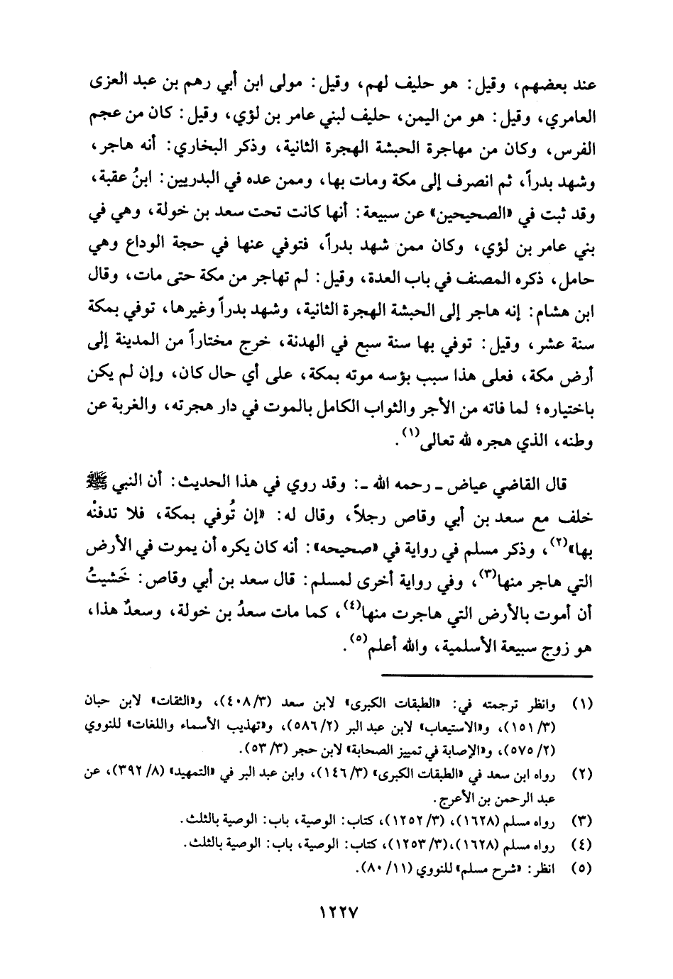 قال القاضي عياض - رحمه الله -: وقد روي في هذا الحديث: أن النَّبيَّ - صَلَّى الله عليه وسلم - خلف مع سعد بن أبي وقاص رجلًا، وقال له: "إن تُوفي بمكة، فلا تدفنْه بها" (¬2)، وذكر مسلم في رواية في "صحيحه": أنه كان يكره أن يموت في الأرض التي هاجر منها (¬3)، وفي رواية أخرى لمسلم: قال سعد بن أبي وقاص: خَشيتُ أن أموت بالأرض التي هاجرت منها (¬4)، كما مات سعدُ بن خولة، وسعدٌ هذا، هو زوج سبيعة الأسلمية، والله أعلم (¬5).