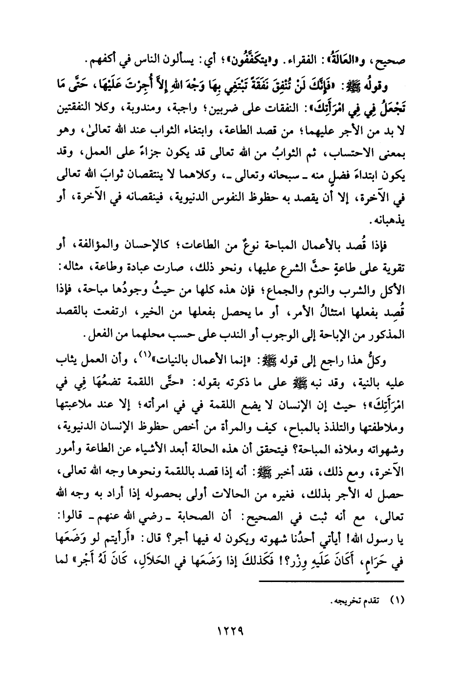 وكلُّ هذا راجع إلى قوله - صَلَّى الله عليه وسلم -: "إنَّما الأعمال بالنيات" (¬1)، وأن العمل يثاب عليه بالنية، وقد نبه - صلى الله عليه وسلم - على ما ذكرته بقوله: "حتَّى اللقمة تضعُهَا فِي في امْرَأَتِكَ"؛ حيث إن الإنسان لا يضع اللقمة في في امرأته؛ إلَّا عند ملاعبتها وملاطفتها والتلذذ بالمباح، كيف والمرأة من أخص حظوظ الإنسان الدنيوية، وشهواته وملاذه المباحة؟ فيتحقق أن هذه الحالة أبعد الأشياء عن الطاعة وأمور الآخرة، ومع ذلك، فقد أخبر - صلى الله عليه وسلم -: أنه إذا قصد باللقمة ونحوها وجه الله تعالى، حصل له الأجر بذلك، فغيره من الحالات أولى بحصوله إذا أراد به وجه الله تعالى، مع أنه ثبت في الصحيح: أن الصحابة -رضي الله عنهم- قالوا: يا رسول الله! أيأتي أحدُنا شهوته ويكون له فيها أجر؟ قال: "أَرأيتم لو وَضَعَها في حَرَامٍ، أَكَانَ عَلَيهِ وِزْر؟! فَكَذلكَ إذا وَضَعَها في الحَلاَلِ، كَانَ لَهُ أَجْر" لما