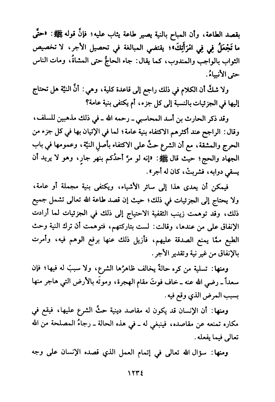 وقد ذكر الحارث بن أسد المحاسبي - رحمه الله - في ذلك مذهبين للسلف، وقال: الراجح عند أكثرهم الاكتفاء بنيَّة عامة؛ لما في الإتيان بها في كل جزء من الحرج والمشقة، مع أن الشرع حثَّ على الاكتفاء بأصلِ النيَّة، وعمومها في باب الجهاد والحج؛ حيث قال - صلى الله عليه وسلم -: "إنه لو من أحدُكم بنهر جارٍ، وهو لا يريد أن يسقي دوابه، فشربتْ، كان له أجر".