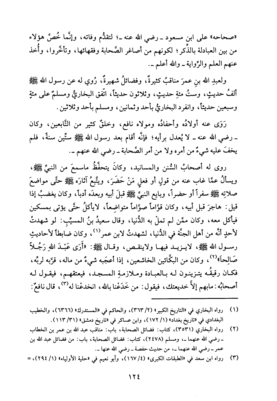 "صحاحه" على ابن مسعود - رضي الله عنه -؛ لتقدُّم وفاته، وإنَّما خُصَّ هؤلاء من بين العبادلة بالذِّكر؛ لكونهم من أصاغر الصَّحابة وفقهائها، وتأخروا، وأخذ عنهم العلم والرِّواية -والله أعلم-.