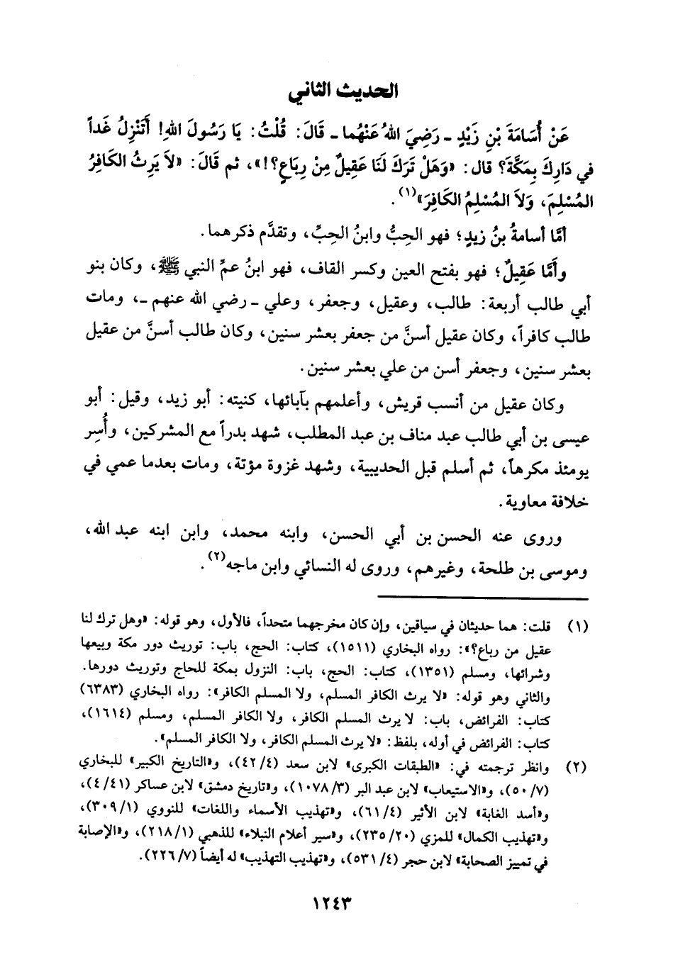 عَنْ أسَامَةَ بْنِ زَيْدٍ -رَضِيَ اللهُ عَنْهُما- قَالَ: قُلْتُ: يَا رَسُولَ اللهِ! أتَنْزِلُ غَدًا في دَارِكَ بِمَكَّةَ؟ قال: "وَهَلْ تَرَكَ لَنَا عَقِيلٌ مِنْ رِبَاعٍ؟! "، ثم قَالَ: "لَا يَرِثُ الكَافِرُ المُسْلِمَ، وَلَا المُسْلِمُ الكَافِرَ" (¬1).