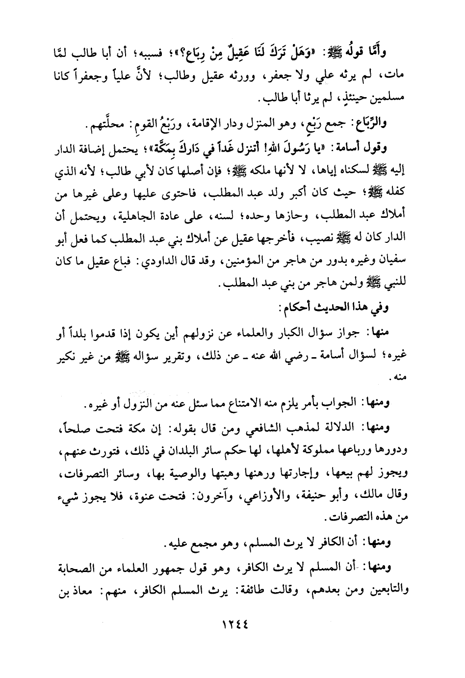 وأَمَّا قولُه - صلى الله عليه وسلم -: "وَهَل تَرَكَ لَنَا عَقِيلٌ مِنْ رِبَاع؟ "؛ فسببه؛ أن أبا طالب لمَّا مات، لم يرثه عليّ ولا جعفر، وورثه عقيل وطالب؛ لأنَّ عليًّا وجعفرًا كانا مسلمين حينئذٍ، لم يرثا أبا طالب.