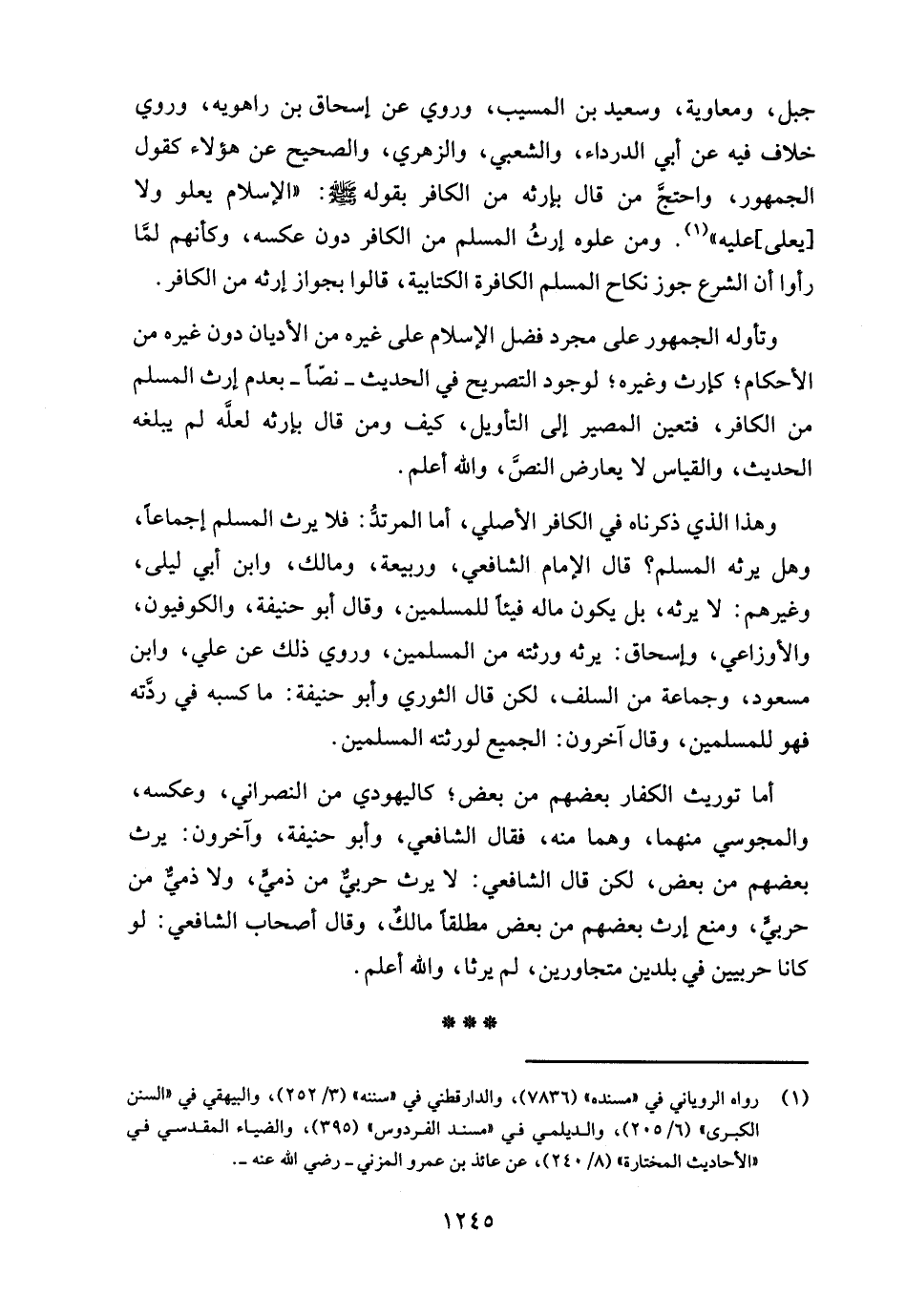 جبل، ومعاوية، وسعيد بن المسيب، وروي عن إسحاق بن راهويه، وروي خلاف فيه عن أبي الدرداء، والشعبي، والزهري، والصحيح عن هؤلاء يقول الجمهور، واحتجَّ من قال بإرثه من الكافر بقوله - صلى الله عليه وسلم -: "الإسلام يعلو ولا [يعلى] عليه" (¬1). ومن علوه إرثُ المسلم من الكافر دون عكسه، وكأنهم لمَّا رأوا أن الشرع جوز نكاح المسلم الكافرة الكتابية، قالوا بجواز إرثه من الكافر.