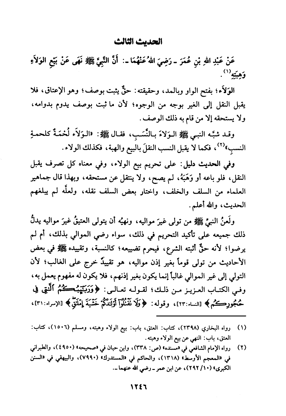(¬1) رواه البُخاريّ (2398)، كتاب: العتق، باب: بيع الولاء وهبته، ومسلم (1506)، كتاب: العتق، باب: النَّهي عن بيع الولاء وهبته.