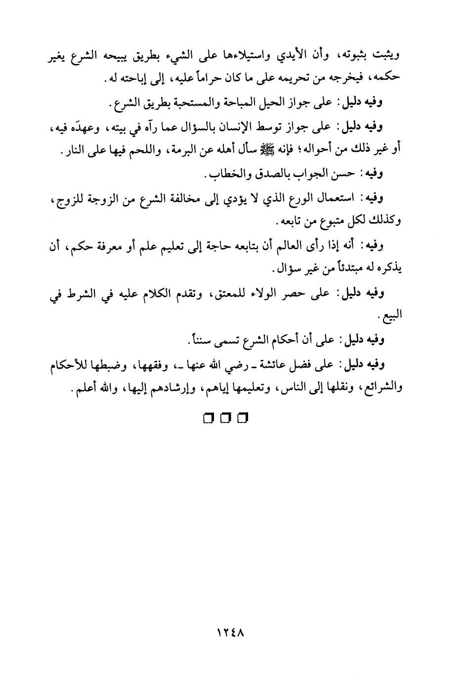 وفيه دليل: على فضل عائشة - رضي الله عنها -، وفقهها، وضبطها للأحكام والشرائع، ونقلها إلى النَّاس، وتعليمها إياهم، وإرشادهم إليها، والله أعلم.
