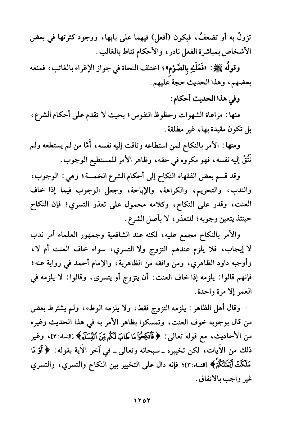 والأمر بالنكاح مجمع عليه، لكنه عند الشافعية وجمهور العلماء أمر ندب لا إيجاب، فلا يلزم عندهم التزوج ولا التسري، سواء خاف العنت أم لا، وأوجبه داود الظاهري، ومن وافقه من الظاهرية، والإمام أحمد في رواية عنه؛ فإنهم قالوا: يلزمه إذا خاف العنت: أن يتزوج أو يتسرى، وقالوا: لا يلزمه في العمر إلا مرة واحدة.