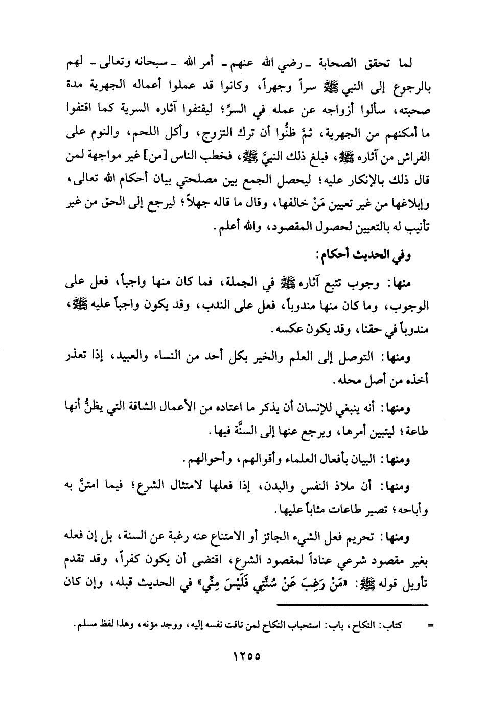 لما تحقق الصحابة - رضي الله عنهم - أمر الله - سبحانه وتعالى - لهم بالرجوع إلى النبي - صلى الله عليه وسلم - سرًّا وجهرًا، وكانوا قد عملوا أعماله الجهرية مدة صحبته، سألوا أزواجه عن عمله في السرِّ؛ ليقتفوا آثاره السرية كما اقتفوا ما أمكنهم من الجهرية، ثمَّ ظنُّوا أن ترك التزوج، وأكل اللحم، والنوم على الفراش من آثاره - صلى الله عليه وسلم -، فبلغ ذلك النبيَّ - صلى الله عليه وسلم -، فخطب الناس [من] غير مواجهة لمن قال ذلك بالإنكار عليه؛ ليحصل الجمع بين مصلحتي بيان أحكام الله تعالى، وإبلاغها من غير تعيين مَنْ خالفها، وقال ما قاله جهلًا؛ ليرجع إلى الحق من غير تأنيب له بالتعيين لحصول المقصود، والله أعلم.
