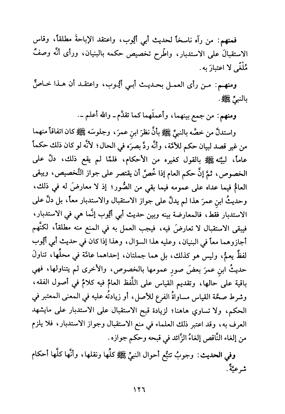 واستدل من خصَّه بالنبي - صلى الله عليه وسلم - بأنَّ نظرَ ابنِ عمرَ، وجلوسَه - صلى الله عليه وسلم - كان اتفاقًا منهما من غير قصد لبيان حكم للأمة، وأنه رد بصرَه في الحال؛ لأنه لو كان ذلك حكمًا عامًّا، لبينه - صلى الله عليه وسلم - بالقول كغيره من الأحكام، فلمَّا لم يقع ذلك، دل على الخصوص، ثمَّ إن حكم العام إذا خُصَّ أن يقتصر على جواز التخصيص، ويبقى العام فيما عداه على عمومه فيما بقي من الصُّور؛ إذ لا معارضَ له في ذلك، وحديث ابنِ عمرَ هذا لم يدل على جواز الاستقبال والاستدبار معا، بل دل على الاستدبار فقط، فالمعارضة بينه ويين حديث أبي أيوب إما هي في الاستدبار، فيبقى الاستقبال لا تعارضَ فيه، فيجب العمل به في المنع منه مطلقًا، لكنهم أجازوهما معًا في البنيان، وعليه هذا السؤال، وهذا إذا كان في حديث أبي أيوب لفظٌ يعمُّ، وليس هو كذلك، بل هما جملتان، إحداهما عامَّة في محلِّها، تناولَ حديثُ ابنِ عمرَ بعضَ صورِ عمومها بالخصوص، والأخرى لم يتناولها، فهي باقية على حالها، وتقديم القياس على اللَّفظ العامِّ فيه كلام في أصول الفقه، وشرط صحة القياس مساواةُ الفرع للأصل، أو زيادتُه عليه في المعنى المعتبر في الحكم، ولا تساوي هاهنا؛ لزيادة قبح الاستقبال على الاستدبار على ما يشهد العرف به، وقد اعتبر ذلك العلماء في منع الاستقبال وجواز الاستدبار، فلا يلزم من إلغاء الناقص إلغاءُ الزائد في قبحه وحكم جوازه.