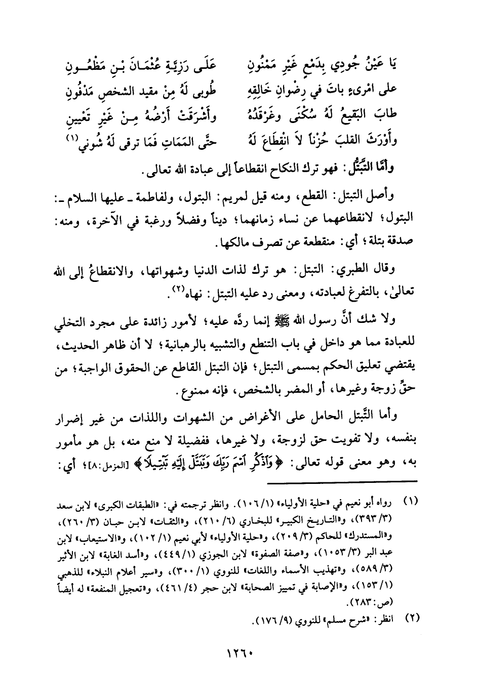 ولا شك أنَّ رسول الله - صلى الله عليه وسلم - إنما ردَّه عليه؛ لأمور زائدة على مجرد التخلي للعبادة مما هو داخل في باب التنطع والتشبيه بالرهبانية؛ لا أن ظاهر الحديث، يقتضي تعليق الحكم بمسمى التبتل؛ فإن التبتل القاطع عن الحقوق الواجبة؛ من حقِّ زوجة وغيرها، أو المضر بالشخص، فإنه ممنوع.