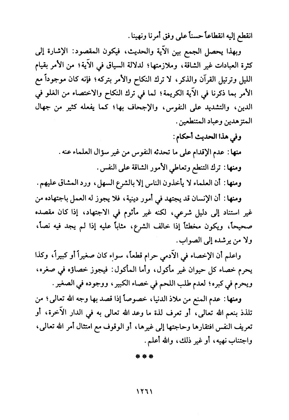 ومنها: عدم المنع من ملاذ الدنيا، خصوصًا إذا قصد بها وجه الله تعالى؛ من تلذذ بنعم الله تعالى، أو تعرف لذة ما وعد الله تعالى به في الدار الآخرة، أو تعريف النفس افتقارها وحاجتها إلى غيرها، أو الوقوف مع امتثال أمر الله تعالى، واجتناب نهيه، أو غير ذلك، والله أعلم.