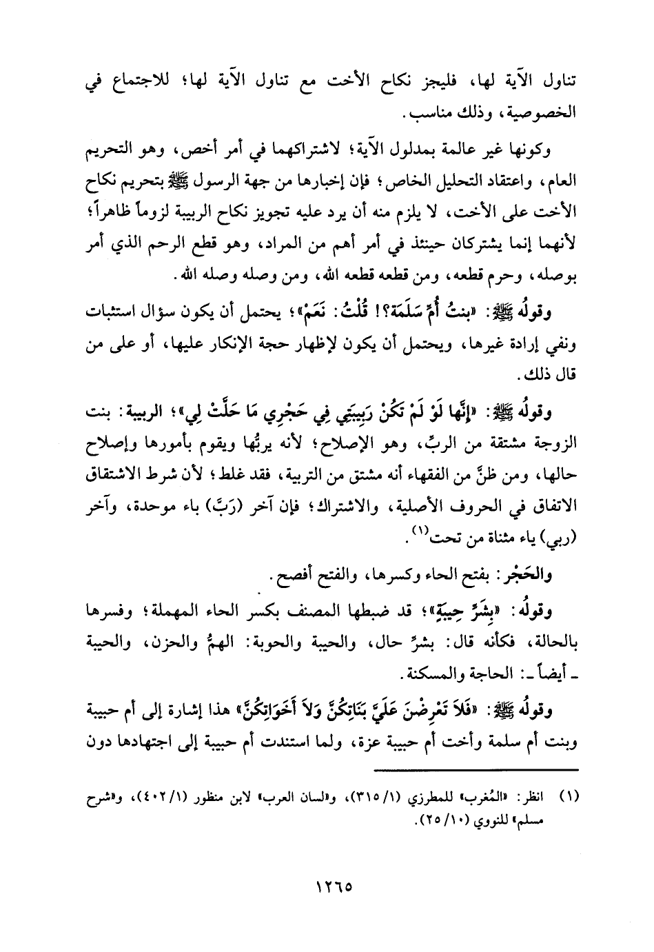 وقولُه - صلى الله عليه وسلم -: "إِنَّا لَوْ لَمْ تَكُنْ رَبِيبَتي فِي حَجْرِي مَا حَلَّتْ لِي"؛ الربيبة: بنت الزوجة مشتقة من الربِّ، وهو الإصلاح؛ لأنه يربُّها ويقوم بأمورها وإصلاح حالها، ومن ظنَّ من الفقهاء أنه مشتق من التربية، فقد غلط؛ لأن شرط الاشتقاق الاتفاق في الحروف الأصلية، والاشتراك؛ فإن آخر (رَبَّ) باء موحدة، وآخر (ربي) ياء مثناة من تحت (¬1).