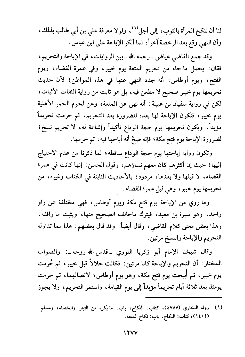 وقال شيخنا الإمام أبو زكريا النووي - قدس الله روحه -: والصواب المختار: أن التحريم والإباحة كانا مرتين: فكانت حلالًا قبل خيبر، ثم حُرمت يوم خيبر، ثم أُبيحت يوم فتح مكة، وهو يوم أوطاس؛ لاتصالهما، ثم حرمت يومئذ بعد ثلاثة أيام تحريمًا مؤبدًا إلى يوم القيامة، واستمر التحريم، ولا يجوز